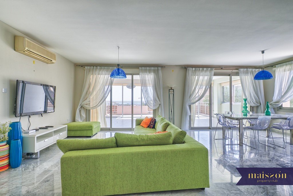The apartment has three bedrooms (third bedroom is not shown, however it has sea view and foldable sofa-bed for two people) 2 bedrooms (master-bedroom has en-suite), living room and open-space kitchen.