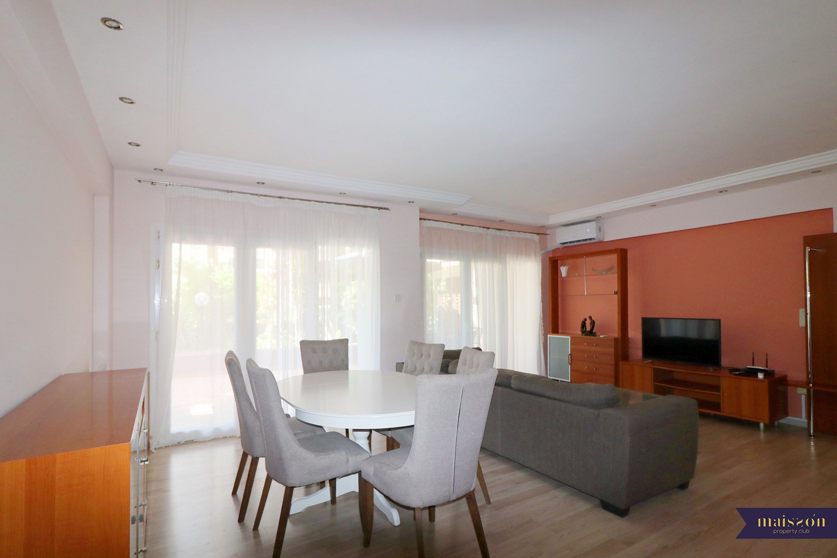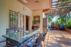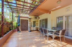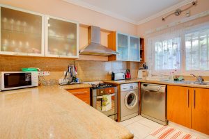 There are 3 bedrooms, 2 bathrooms, open plan kitchen with the living room and big covered garden-veranda. The parking is available.