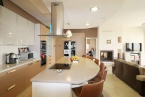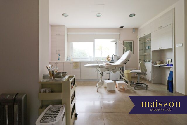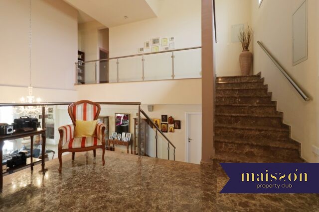 On the second floor there are 3 bedrooms, the master bedroom has a bathroom and a walk-in-wardrobe, there is also a laundry room, 2 verandas and main bathroom upstairs. On the ground floor there is another bedroom with a bathroom, a guest toilet, a dining and living room, a kitchen with another living room, a double sided fireplace and a storage room. Between the two levels, there is another room with a beautiful view, which can be used as a fifth room or office. On the lower level there is a studio with one bedroom, kitchen and maid’s bathroom, while in the pool area there is another bathroom with shower. 3 parking spaces.