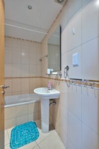 Домик в двух уровнях, на первом этаже гостиная с выходом в садик/веранду и открытого плана полностью оборудованная кухня (холодильник, стиральная машина, плита, духовка, вытяжка, чайник, микроволновка и т. д.), гостевой туалет и кабинет. На втором этаже 3 спальни и 2 ванных. Общая крытая площадь — около 120 м2. Есть парковочное место (открытое).